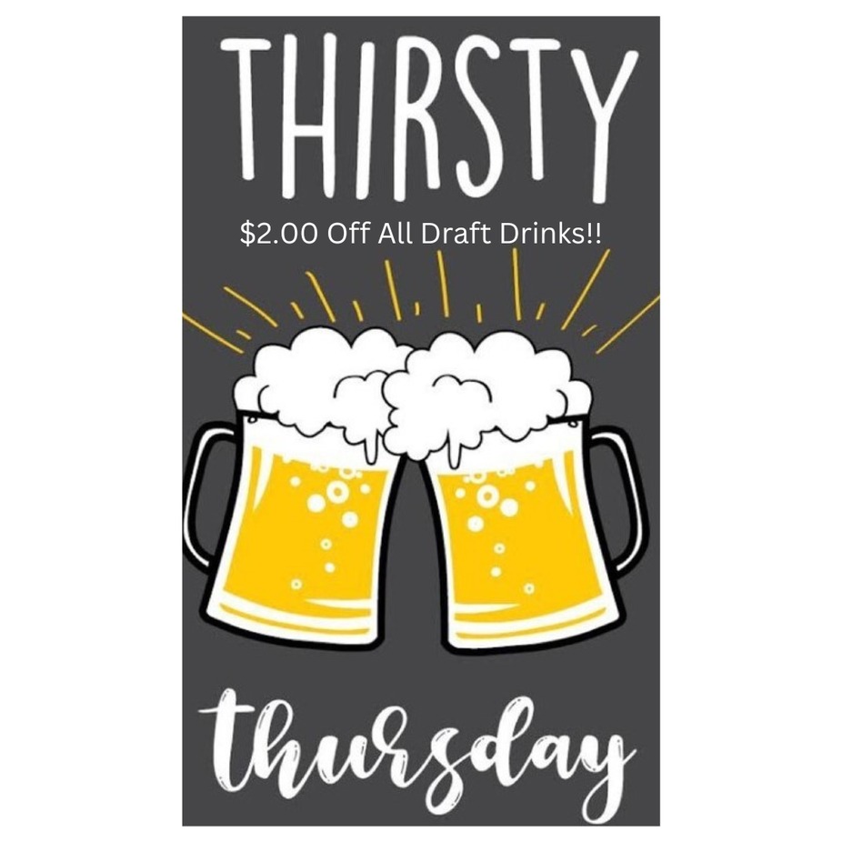 SpecialsThursdayJanuary 15thThirsty Thursday! Enjoy $2 off draft beer12:00 PM - 11:00 PMWednesdayJanuary 21stWine A Lot Wednesday!12:00 PM - 10:00 PM
